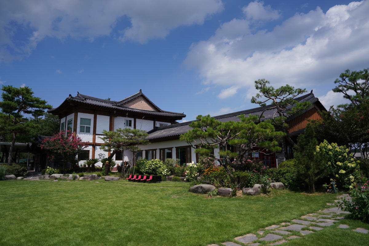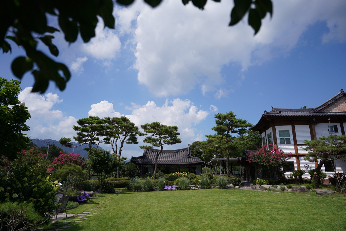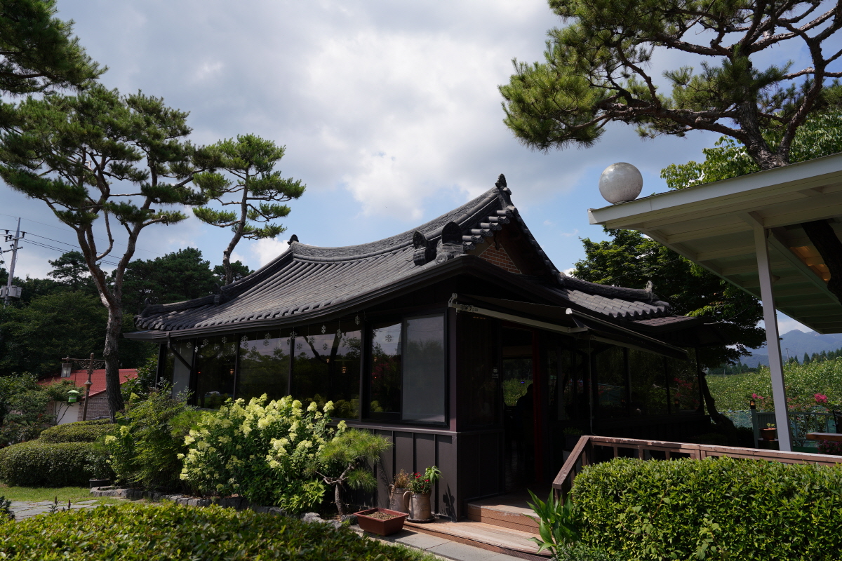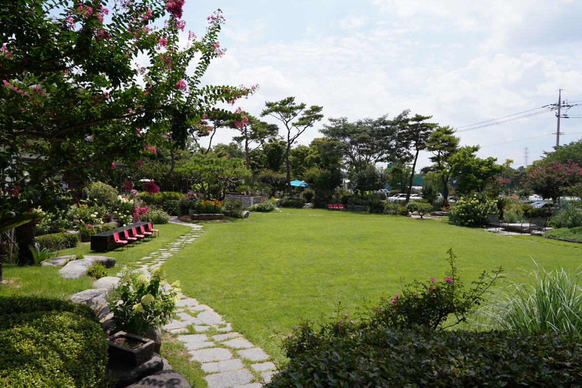 동양 느낌의 한옥과 열대 나무인 야자수, 루드베키아 등의 원예 식물들이 많이 심어져서 동양+서양의 느낌을 받았어요!