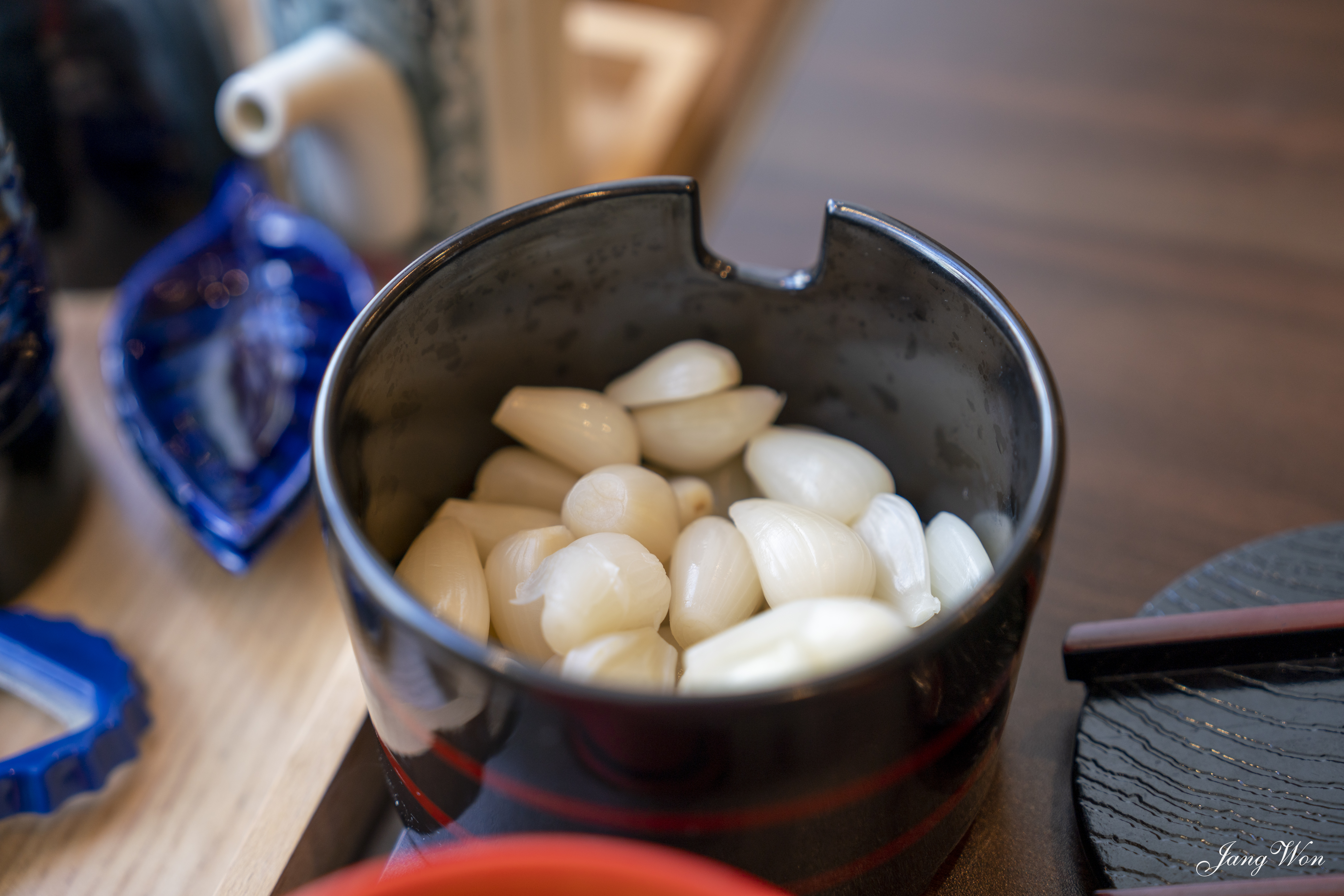 셀프로 먹을 수 있는 반찬은 락교, 단무지가 있고 간장은 파란 나뭇잎 그릇에 따르면 된답니다~